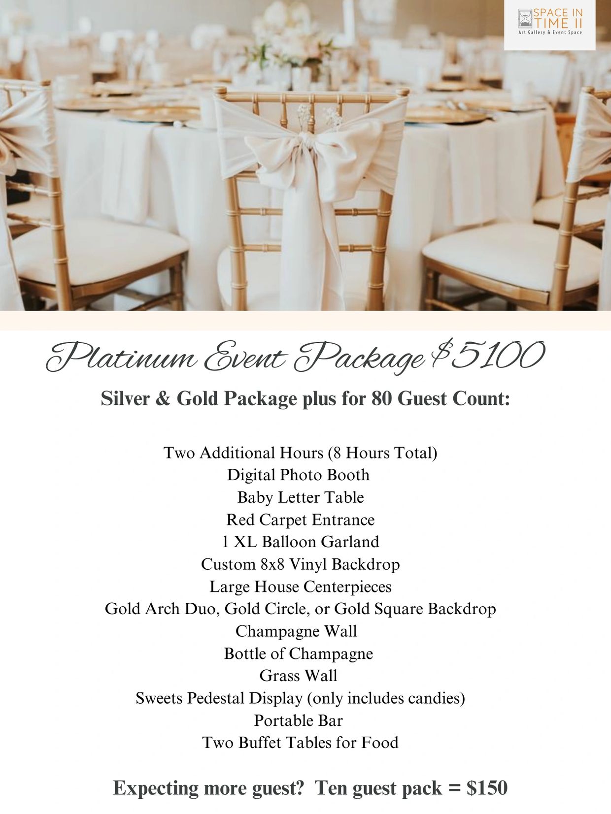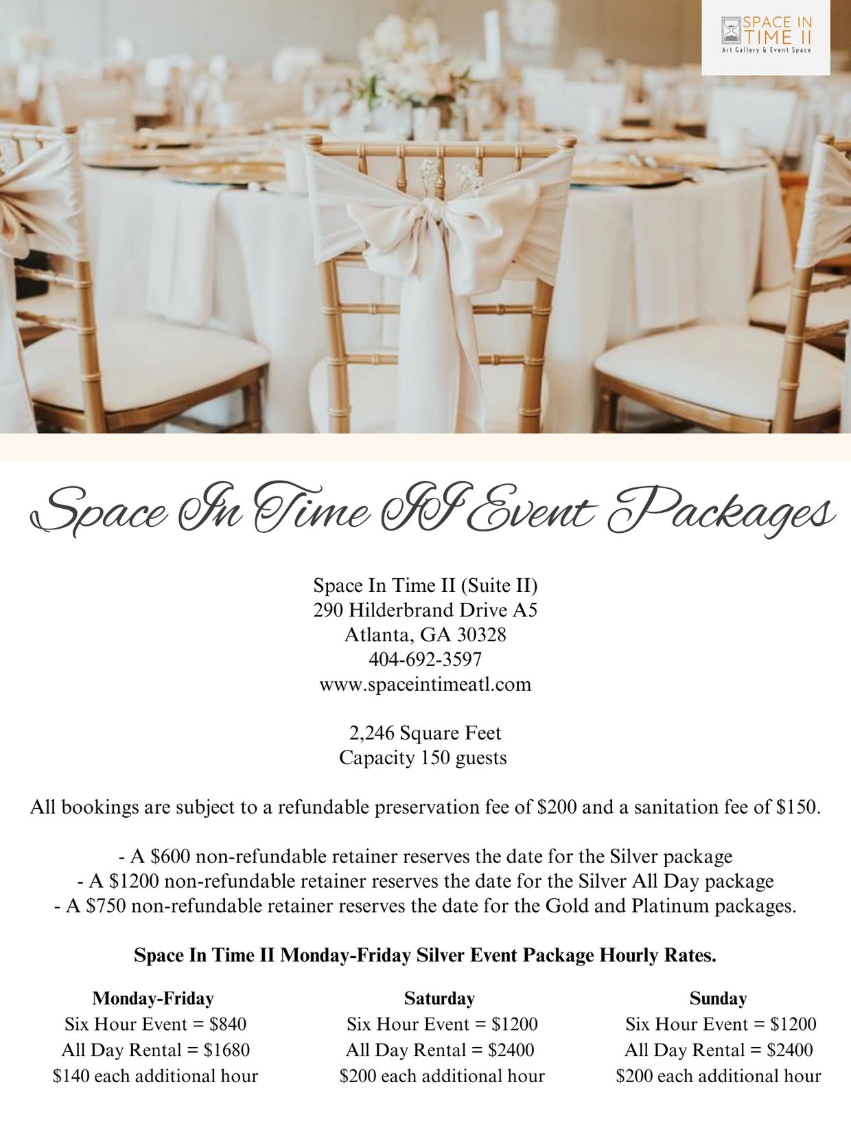 At Space In Time, we have strict time slots on Saturdays. Our venue hours are 8:00 AM-3:00 AM. Due to a city ordinance all events must end at 2:00 AM. The hours 2:00 AM-3:00 AM are designated for cleaning only! This package is for six hours total. Be sure to pick a time slot below: