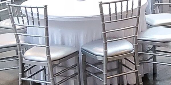 You know that chair you always see at weddings? It's called a Chiavari. It is named after the small Italian town where it originated, the iconic seat—which dates back to the early 19th century—has become a popular pick among party planners due to its simple yet elegant silhouette: a thin, lightweight frame with legs and rails that resemble bamboo. We now provide them as an upgrade. We have 115 of them with silver cushions. They are $5 per chair to rent.