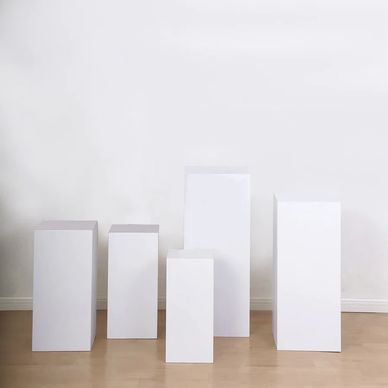 Five square metal white pedestal stands. They are $75 to rent.